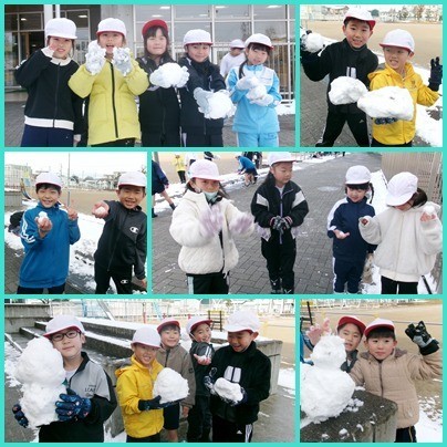 休み時間になると、子どもたちは日陰で残っている雪に集まり、雪遊びをしました。雪だるまを作ったり、雪玉を転がしたり、投げ合ったりと大はしゃぎです。寒さが厳しい中でも、運動場をかけまわり、心も体も元気いっぱいでした。