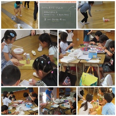 2年生の子どもたちは、今、生活科の時間に「おまちゃ祭り」の準備を進めています。1年生を迎えておもちゃ遊びに楽しんでもらうために、牛乳パックや紙コップ、色紙などいろいろな材料を使って、ユニークで楽しいおもちゃが誕生しています。完成したおもちゃは、実際に動かしてみたり、遊び方を説明したりしながら工夫を重ねています。