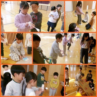おひさま(1年生) 公開日 2025/11/28 更新日 2025/11/28 1年生 2年生が1年生のためにおもちゃまつりを開いてくれました。 「ぼくもおもちゃを作ってみたい」「はやく2年生になりたいな」と1年生は2年生になるのがとても楽しみになったようです。 2年生のみなさん、楽しいおもちゃまつりに招待してくれて、ありがとうございました。