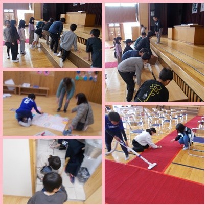 今日の5・6時間目には、とうとう明後日に控えた卒業式に向けて、体育館の隅々まで掃除したり、パイプいすを並べたり、赤じゅうたんを敷いたりして事前準備に取り組みました。準備の途中では6年生も体育館に来てくれて、会場準備のお礼をしてくれました。いよいよ来年度は最高学年です。6年生からさまざまなことを受け継いで立派な最高学年になれるよう頑張っていきます。