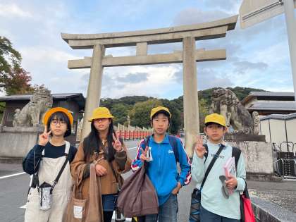 大きな鳥居を最後の班が通りました。夕方になり、肌寒くなってきました。