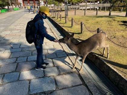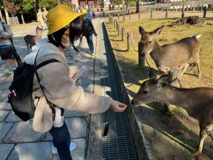 鹿とふれあっています。