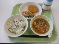 今日の汁ものはとうがん汁です。とうがんは、6月から9月が旬の野菜です。冬まで保存がきくことから漢字では冬の瓜と書 いて、とうがんという名前になりました。大きいものだと10kgくらいの重さになるそうです。そして、全体の90%以上が水分 です。愛知県でもたくさん栽培されており、全国 で2番目 に多 く作 っています。えだまめコロッケと一緒 に季節 の味を味わいましょう。