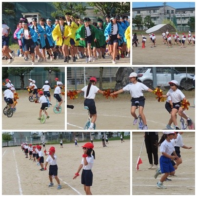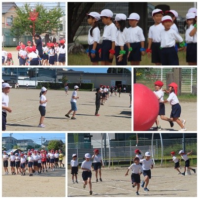 一年生の子どもたちにとっては、小学校での初めての運動会。広い運動場で、元気いっぱいに練習しています。音楽に合わせて笑顔で体を動かすダンス、玉入れでは友達と力を合わせて取り組んでいます。また、徒競走では、スタートの合図にあわせて全力で駆け抜けています。