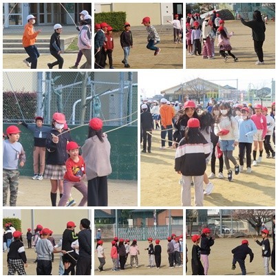 今日の昼休み、子どもたちは風が強く肌寒い中でも、運動場に元気に出ていました。いくつかの学級が縄跳び大会に向けて自主的に練習に取り組み、互いに励まし合いながら楽しむ姿が見られました。