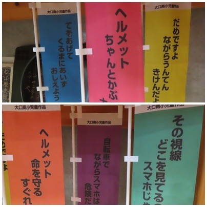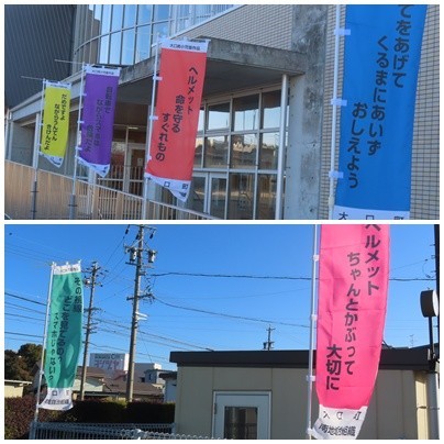 南地域自治組織様の主催で、子どもたちが考えた交通安全標語をデザインしたのぼり旗が完成し、西門から玄関にかけての道と北門付近に立てられました。色とりどりののぼり旗には、ヘルメットの着用の徹底やスマートフォンの安全利用など、子どもたちの命を守る大切なメッセージがこめられており、子どもたちや地域の方々に交通安全を呼びかけています。