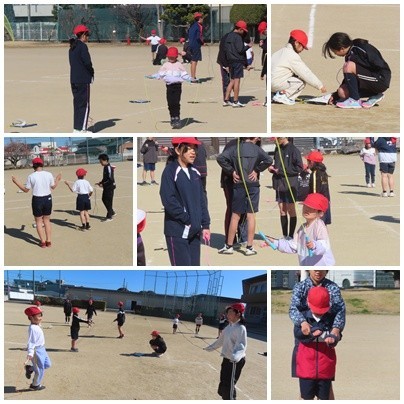 体育の時間、1年生と6年生のペア学級で、縄跳びの学習に取り組みました。6年生が1年生に縄跳びの跳び方について、優しく教え、手を取って一緒に跳んでいる微笑ましい姿が見られました。