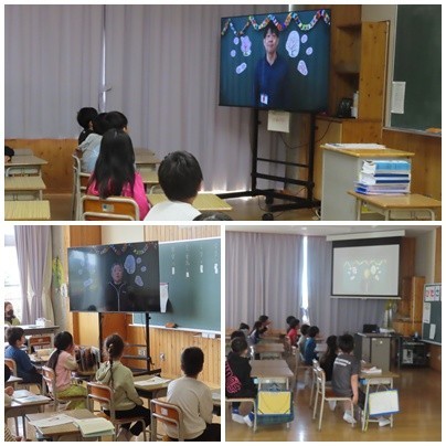 業前の時間に、転任された先生方からのビデオレターを全校で視聴しました。画面越しではありますが、お世話になった先生方から子どもたちに向けて、温かいメッセージを届けていただきました。