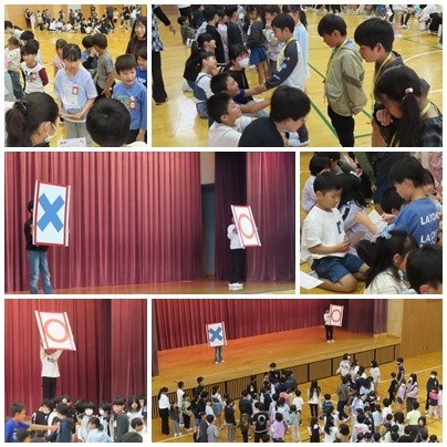 また、全校○✕クイズでは、みんなで楽しく参加し、南小学校の「あすなろっこ」のルールを確認しました。最後に全校で校歌を歌いました。