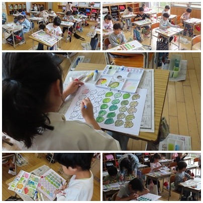 3年生の図画工作科では、水彩絵の具の特徴を生かしながら、木の葉の色づくりに取り組みました。子どもたちは、淡い色の重なりや微妙な色の違いを工夫し、葉の一枚一枚を丁寧に表現していました。水彩画ならではの、やわらかな色合いを楽しみながら、思い思いの作品を仕上げる姿がみられました。