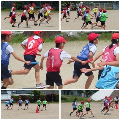 運動場では、6年生の子どもたちがリレーのバトンパスの練習を何度も繰り返し行っていました。練習を重ねるごとに、受け渡しのタイミングや声の掛け合いがよくなり、バトンパスの息も合ってきています。真剣に練習に取り組む姿が見られました。
