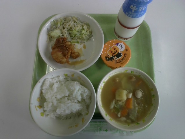 みんなのようす ◆今日の献立 ごはん 牛乳 ポトフ 揚げどりのレモンソース じゃこキャベツ かぼちゃプリン ※給食メッセージ 今日10月31日はハロウィンです。ハロウィンはアメリカのお祭りです。かぼちゃをくり抜いて作る「ジャック・オ・ランタン」を飾ることもありますね。古代ケルト人の食べ物の収穫に感謝するお祭りが元になっている行事です。かぼちゃには、かぜを予防するビタミンAやビタミンCが多く含まれ、かぜをひきにくくしてくれます。かぼちゃを食べて、寒さの本番に備えましょう。