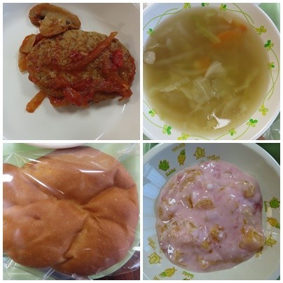 今日のデザートは、「フルーツゼリー」です。みかんと桃、湘南ゴールドという柑橘類の果汁でできたゼリーを和えました。