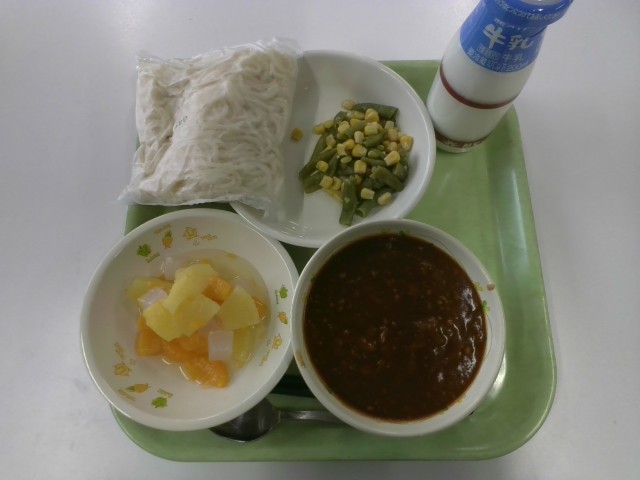 今日はソフトめんのミートソースかけです。ミートソースはイタリアのボロネーゼを日本風にアレンジした料理です。甘くて赤いミートソースは、日本人に親しみやすいように、トマトをたっぷり使い、ひき肉は多めで、ケチャップやソースで味付けして作ったものです。赤いミートソース文化は日本で生まれたスタイルです。