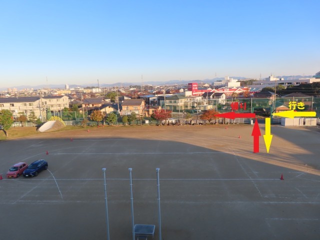 一般会員の方は、1枚目の写真のように入っていただいて、案内係の指示に従って駐車してください。終了後の退場経路も図で示しております。入り方、出方はすべて左折でお願いします。