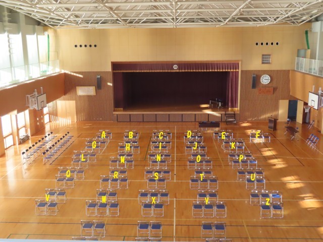 体育館内では、座席位置が決められております。2枚目の写真をご確認のうえ、指定されたA~Zの位置にお座りください。