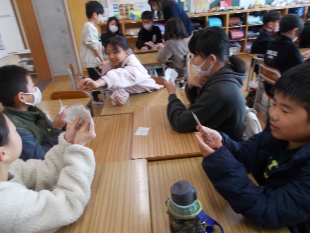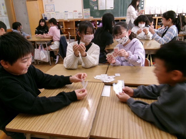 グループ対抗で、仲良くかるたとり大会をして楽しみました。