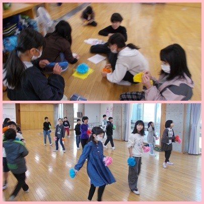 5時間目には学年での親睦を深められるよう「学年レク」をおこないました。5年生しかいない広々としたグラウンドでしっぽとりとボール陣地とりをおこない、チームで協力して作戦を練ったり体を動かしたりできました。