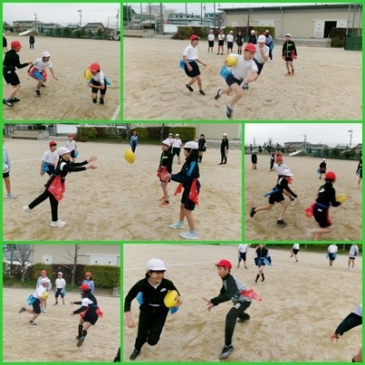 今日の合同体育の時間はタグラグビーを行いました。より多く点を取るために、より少ない点数で守るために各チームで作戦を考えながら試合に臨みました。仲間と声をかけ合ったりパスを回したりと協力して授業に臨む姿が見られました。