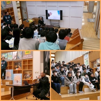体育館で1年生の合唱を聴いたり、教室に行って授業を見させてもらったりしました。