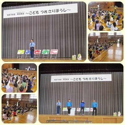 今日は北地域自治組織の皆様,愛知県警察の方にお越しいただいて連れ去り防止教室が実施されました。劇を交えた楽しいお話の中で,「つ・み・き・お・に」について改めて教えていただきました。怪しい人は,黒づくめの恰好とは限らず普通の服装なこともあること,連れていかれそうになったら手足をバタバタさせて,大きな声で助けを呼ぶことなどを楽しく学ぶことができました。今日学んだことを,またお家の人にも伝えるとともに,今後怖い目に合わないようにしっかり覚えておけるとよいですね。