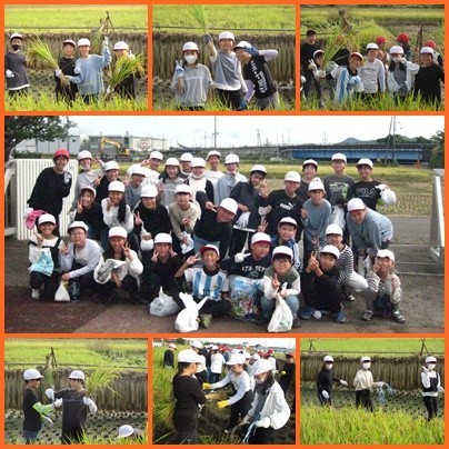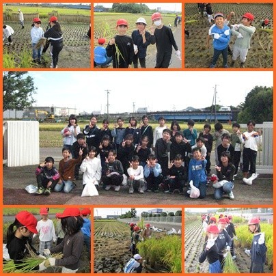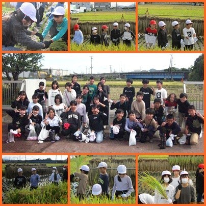6月の田植えから4か月が経ち、みんなで植えた稲を刈るときが来ました!かまを上手に使い、役割分担しながら稲を束ねました。大口町環境を守る会の方々の努力や工夫のおかげでここまで美しく、安全な米作りができました。いつもみんなのもとに届くすべてのお米や野菜、他の食材も同じです。感謝の気持ちを込めて「いただきます。」を言えると素敵ですね。