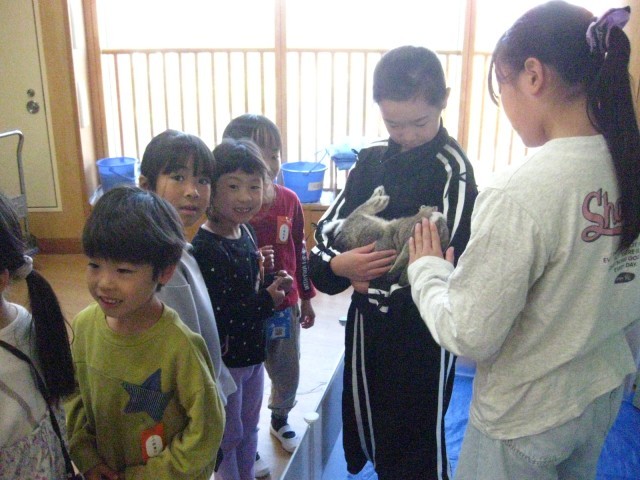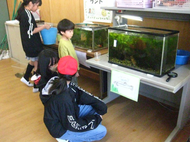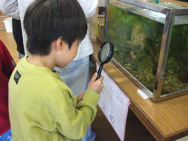 さっそく、1年生の子どもたちがうれしそうに生き物を観察していました。