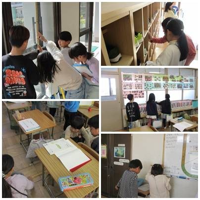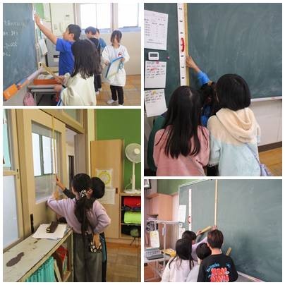 教室や昇降口へ行って様々な場所の長さを1メートルものさしや30センチものさしを使用して長さを測りました。