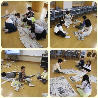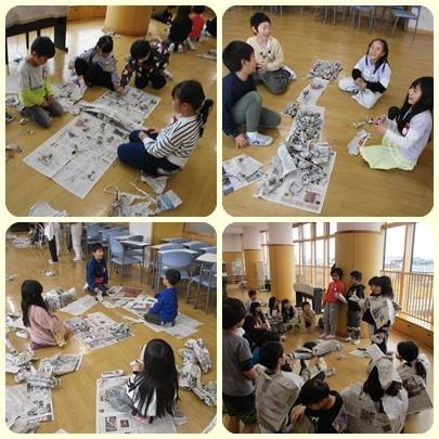 図工の学習で,新聞紙をかぶったり丸めたり,ねじったり,やぶったり… いろいろ試しながらグループで作品を作りました。お店屋さんや,倉庫,素敵なお洋服などなど各グループ工夫がいっぱいで,楽しい作品が出来上がりました。