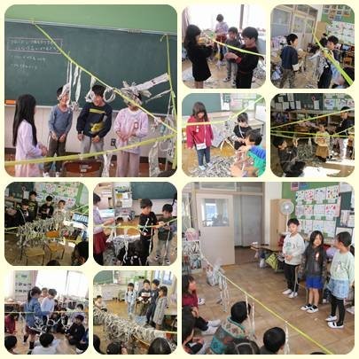 今日は先週の「しんぶんしとなかよし」の学習で使った新聞を使って,まずはダンス!ポンポンみたいにして持って踊ったり,紙吹雪みたいに上へなげたり,1か所に集めた上にだいぶしてみたり。体全体使って楽しみました。その後は班ごとに,細長くちぎった新聞をつなげたりつないだりして作品をつくりました。各班,いろいろ試して工夫を凝らし,想像を広げながら作り上げていきました。