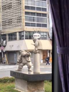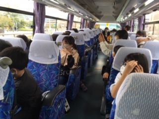 バスの中から、京都市内を楽しんでます。みんな牛若丸と弁慶の像や、京都タワーに夢中です。