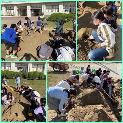 砂場から、5年生の楽しそうな声が響いてきました。理科の実験の準備をしているようです。柔らかくした砂で大きな山を作ったり、川を作ったり、橋を作ったりしています。「流れる水の働き」を体感するために、砂場で箱庭を作っていました。この後、実際に水を流し、水の力について学びました。