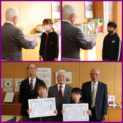 本日、大口町体育協会の方がお見えになり、日本拳法や空手の大会で優秀な成績を収めた二名が、表彰を受けました。「これからの活躍も期待しているよ」と声をかけていただきました。