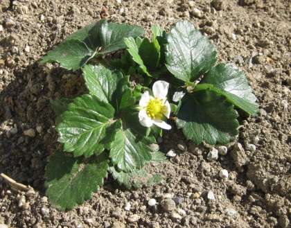 今年一番の寒さの日、6組の花壇でがんばって咲く苺の花を発見しました。つい、白い花に目がいってしまいます。