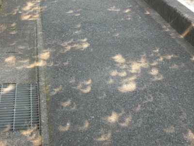さて,写真は金環日食後の7時50分ごろの写真です。学校北の歩道に木漏れ日が映っていました。太陽の形が,日食の三日月の形になっていました。