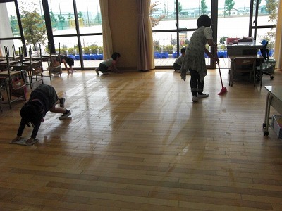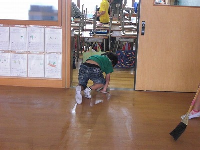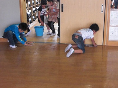1年生は6年生や先生と一緒に掃除に一生懸命に取り組んでいます。写真は水ぶき掃除をがんばっている子どもたちです。