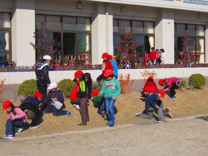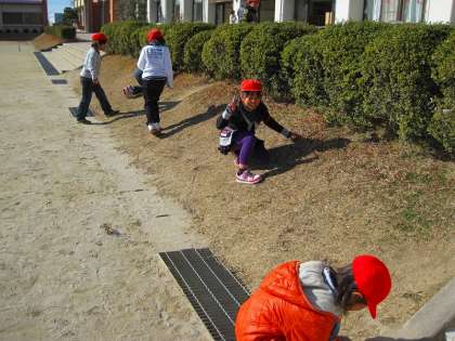 1年生の外掃除の様子です。風があり寒くても、支援員さんたちと一緒に草を抜いていました。