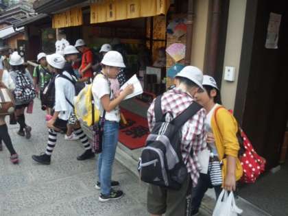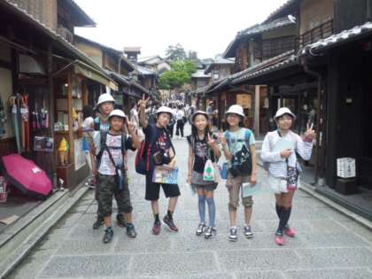 三年坂からはお買い物OKです。みんな次々とお店をのぞいて、お土産を買っています。やはり一番人気は生八つ橋!家族のみなさん、待っててね。
