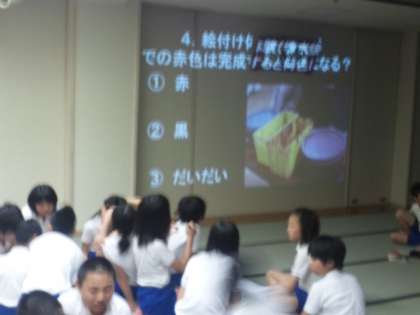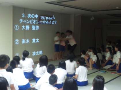 学年集会、続いては修学旅行クイズ大会です。事前学習の成果は発揮できたかな?