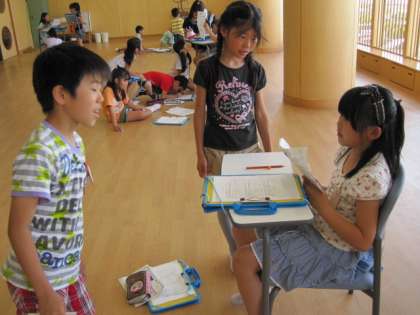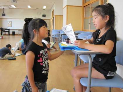 6月4日に総合的な学習の時間で行ったしせつ見学の発表会を学級で行いました。中央公民館,役場,温水プール,給食センターと4か所に分かれて見学したため,お互いが学習してきたことを伝え合うことができました。1人2分という時間で新聞を見せながら発表するのは大変でしたが,国語で学習した聞き方名人と話し方名人を意識して,笑顔で発表し合うことができました。