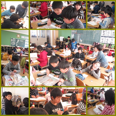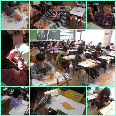 2月5日(木)3年生の教室をのぞいてみたら、1組は社会の授業をしていました。大口町の歴史民俗資料館を見学したときのメモを基に、昔の道具について、はがきくらいの紙にイラストを入れてまとめていました。見学したことだけではなく、本で調べて詳しく書いている子どももいました。2組と3組は、図工の授業でした。プチプチや厚紙、表面がでこぼこした紙などを使って、版画の基になるシートを作っていました。どの子も、完成したときの効果を想像しながら、作品に取り組んでいました。
