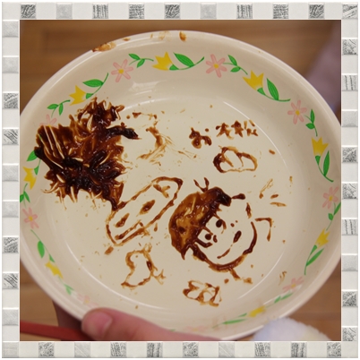 お皿についた余った味噌で,串カツの串を筆代わりにして…