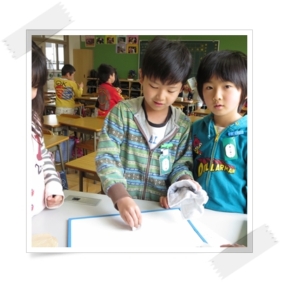ホワイトボードの汚れを丁寧に取ってくれる男の子がいました。