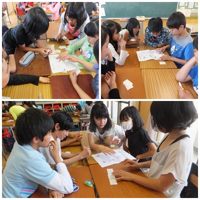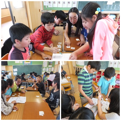 グループ単位で,「サンレモの冒険」というゲームをしました。友達が配られたヒントカードの内容を聞いて,絵カードを当てはめていくゲームです。ヒントカードは,他の友達に見せてはいけないルールです。何度も聞き合い,知恵を出し合って解答を見つけていきました。時間が経つにつれて,活発に意見を交流する姿が見られました。