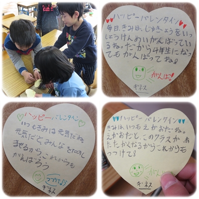 みんなにほめ言葉を伝えたいということで,ハートの紙に一生懸命,丁寧な文字で,同じ内容にならないよう書き込んでいました。