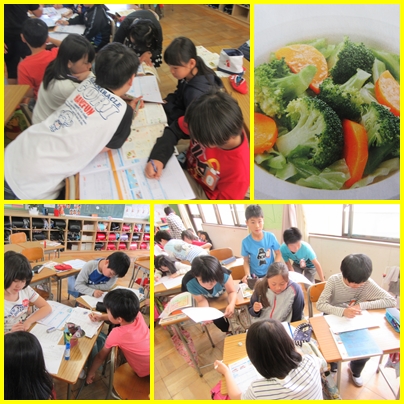 5年1組の調理実習はいよいよ明日。自然教室で行う野外炊事の練習も兼ね、野菜を切り、ゆで野菜のサラダとゆで卵を作ります。もちろん自然教室の班で行います。おいしく作るために、明日に向けて計画を立てました。班の仲間と真剣に交流したり協力して計画を進めたりしている様子がステキでした。明日が楽しみです。