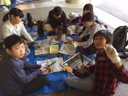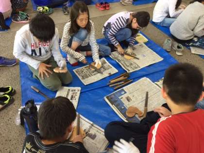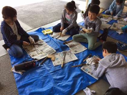 とうとう楽しかった自然教室も最後の活動になりました。今年の焼き杉は、ニワトリです。角をがんばって削ってます。
