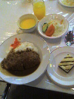 お昼ご飯は、カツカレー、スープ、野菜サラダ、ケーキ、ジュース。豪華です。