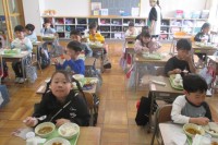 4月14日(火) 初めての給食を食べました。メニューは、皆が大好きなカレーでした。給食の準備や、配膳の仕方などの話を聞いた後、待ちに待って「いただきます!」にこにこ笑顔で、「おいしい。」「カレー大好き...