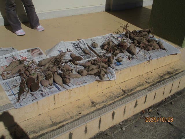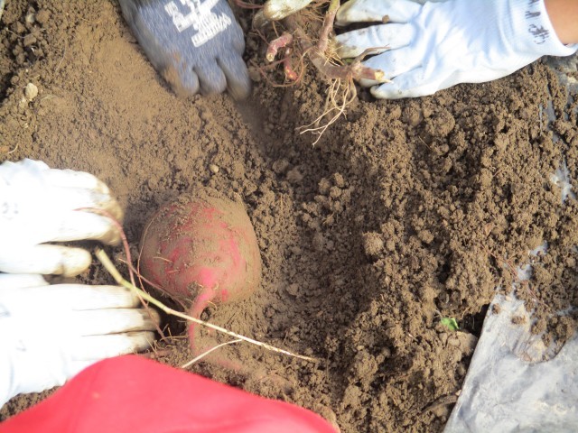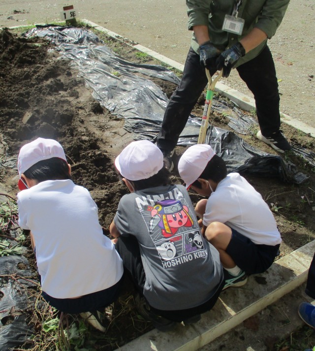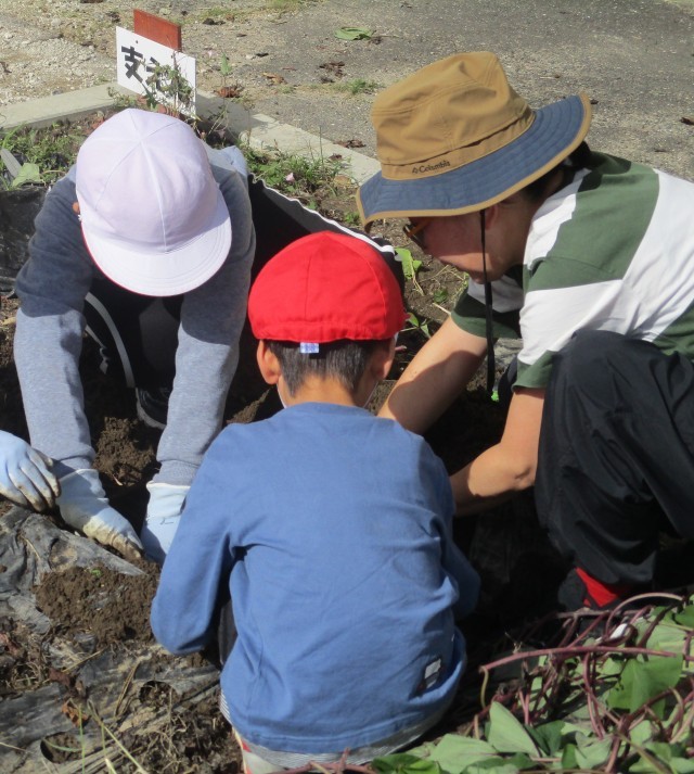植えたサツマイモの収穫をしました。サツマイモを傷つけないように気を付けて、丁寧に掘りました。大きなサツマイモがたくさん出てきてびっくりしました。